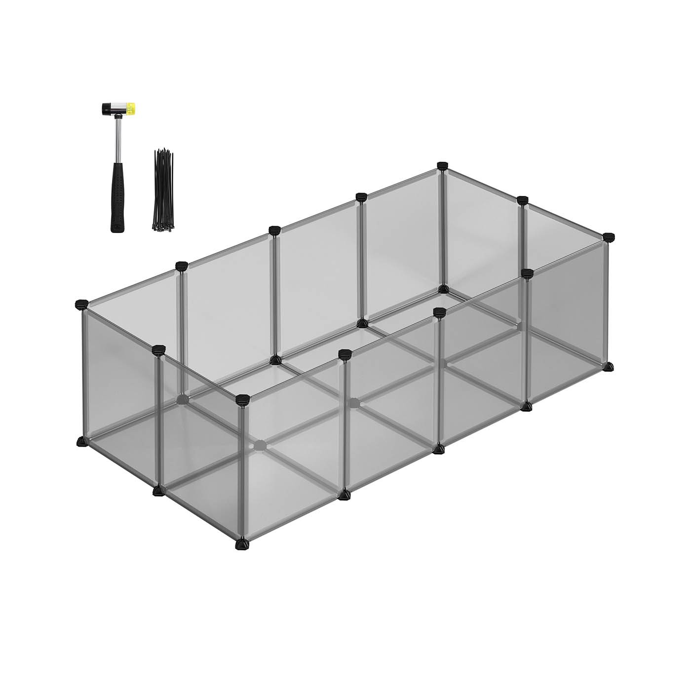 Whether you are keeping adorable guinea pigs, hamsters or a rabbit, the SONGMICS pet playpen will provide them a roomy place to run and explore their environment for a healthy life.DIY Customisable Playpen: Build an exercise pen with this DIY method, it will make your little friends feel like part of the family with freedom of movement and exceptional security. The plastic panels can be assembled freely with a stable floor (the angle between two panels can only be fixed at 90° or 180°.Easy to Assemble: The enclosure can be set up quickly and easily following illustrated instructions. A mallet and 30 cable ties are included to connect the panels for more stability.Simple and Safe Enclosure: Transparent plastic panels allow you to watch your pets from all sides and keep an eye on the little rascals. Safe for both humans and animals, the plastic material is ordourless and easy to clean with a simple wipe. Specifications:Colour: GreyMaterial: PP Plastic Panel, ABS Plastic ConnectorProduct Size: 143 x 73 x 46 cm (L x W x H)Weight: 4.15 kgPackage Contents:12 x Plastic Sheet (45 x 35 cm)8 x Plastic Sheet (35 x 35 cm)27 x Plastic Connector30 x Cable Tie1 x Mallet1 x Instructions (EN, DE, FR, ES, IT)SONGMICS Notes:The pen is intended for small pets only, it is not recommended for dogs or cats. During assembly, please make sure the corners of the sheets are inserted into the bottom of the connectors entirely to add security.Connect two sheets to the structure side by side with 2 cable ties. Do not sit on the products and keep it away from fire and heat sources. Please do not use it outdoors for extended periods of time.