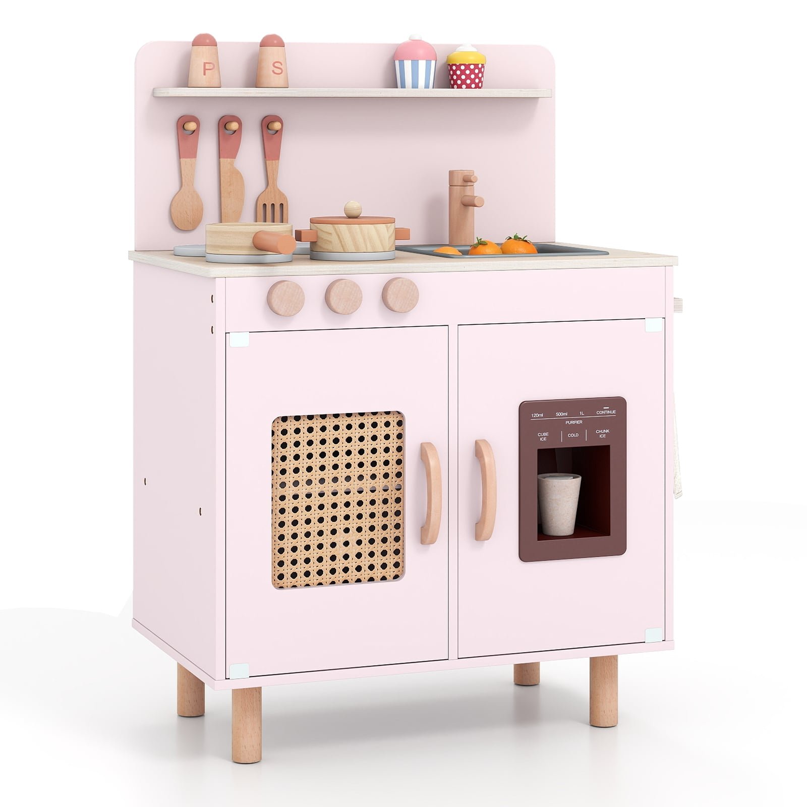 Color: Yellow/Pink Material: MDF, Schima Wood Product Dimensions: 52 x 31 x 73 cm (L x W x H) Height of Countertop: 50 cm Recommended Age: 3+ Years Old Net Weight: 7.5 kg Is Assembly Required: Yes Box Qty: 1 Package Includes: 1 x Play Kitchen 1 x Stew Pot with Lid 1 x Water Sink 1 x Kitchen Knife 1 x Spatula Set 1 x Frying Pan 2 x Seasoning Bottles 2 x Ice Cubes 1 x Ice Cup 1 x Instruction