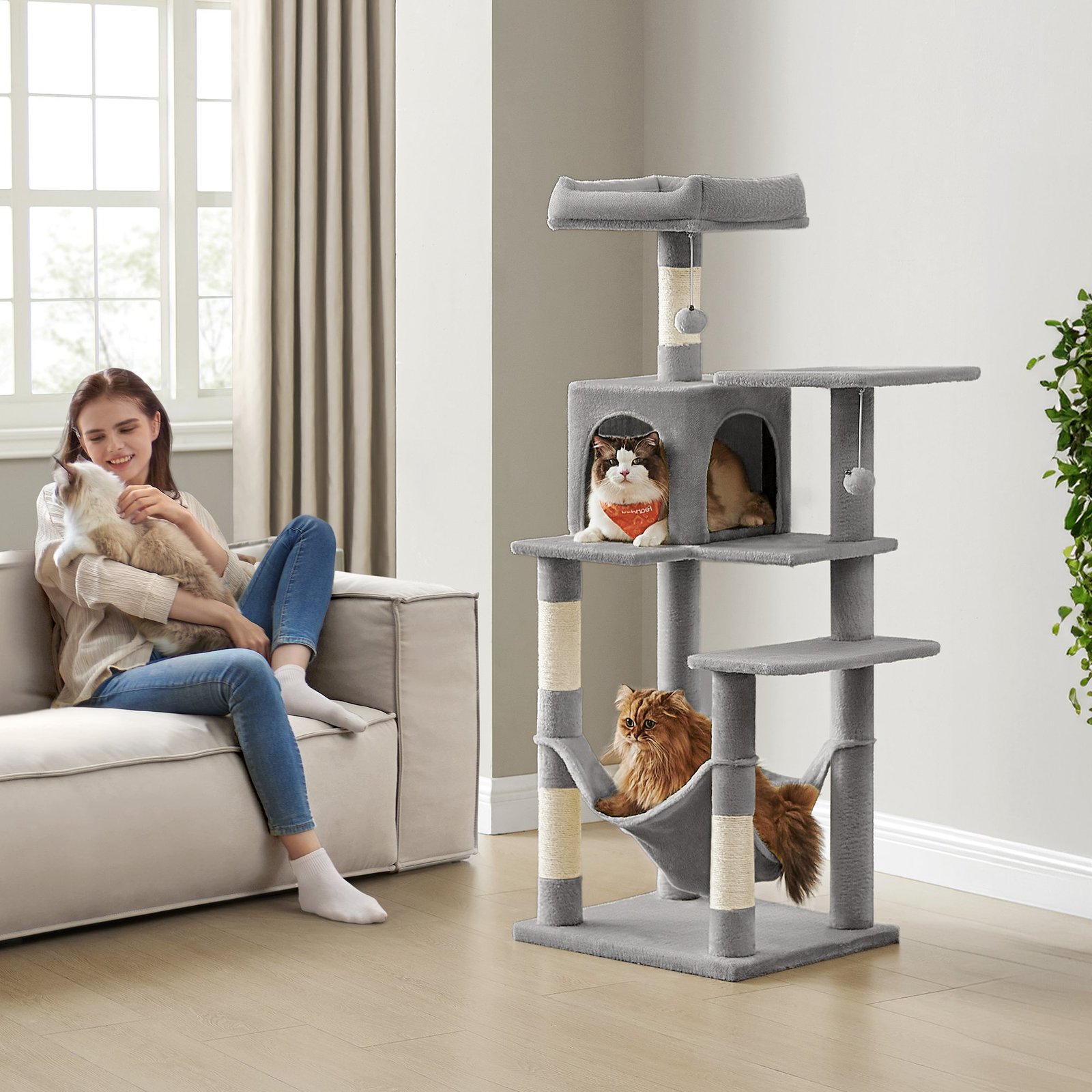 Inside the creative workshop of FEANDREA, two sweet kittens jump around, personally examining our scratching trees and giving their animal feedback. Thus, the designers of FEANDREA get to know firsthand whether the products meet the requirements of pampered whisker wearers.The Highlights of This Cat Tree at a Glance:- Soft, durable plush fabric- 1 comfortable cat cave to hide in- 1 stable hammock for relaxation- 1 well-padded perch to observe the surroundings- 1 pompom for more funSpecifications:- Colour: Light Grey- Material: Particleboard, Plush Fabric, Sisal- Product Size: 55 x 45 x 143 cm (L x W x H)- Product Weight: 13 kgPackage Contents:- 1 x Cat Tree- 1 x Anti-Tip Kit- 1 x Accessory Kit- 1 x InstructionsFEANDREA Notes:- If your cat starts to chew or eat the fluffy ball or elastic band, please remove the toys and keep them out of the reach of your cat.- If the cat cave is damaged, please repair or replace it in time to avoid the risk of injury due to damaged parts.- Attach the product to the wall with the anti-tip kit included for safe use.