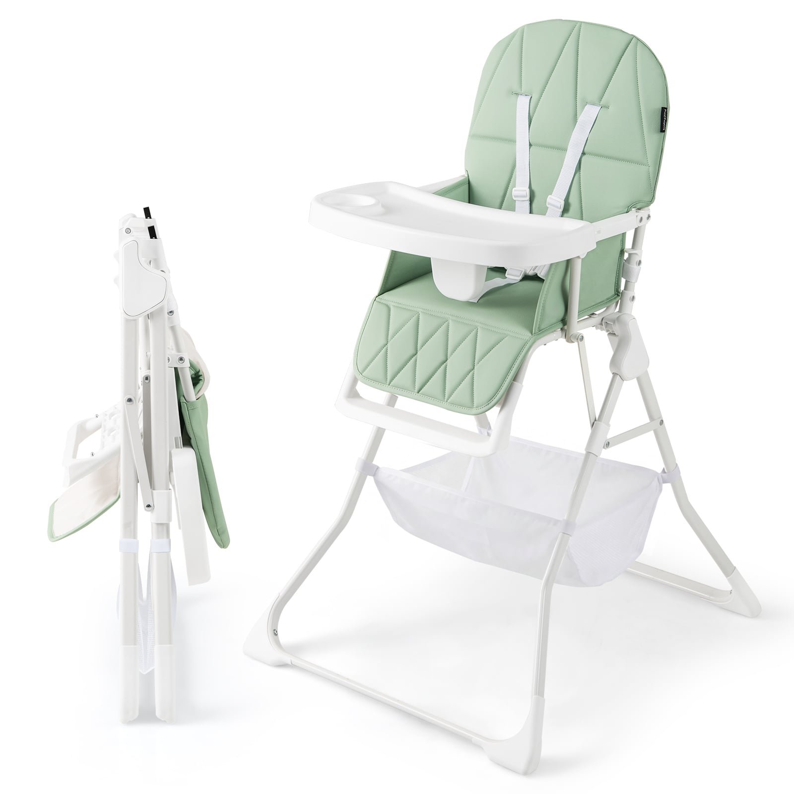 Our foldable baby high chair will be an ideal option. The skin-friendly PU seat cushion ensures comfy seating. With tray adjustment button and footrest adjustment button, the tray and the footrest can be adjusted in 3 positions, meeting babies’ needs of different growing stages. The removable and dishwasher-safe tray is also super easy to clean. 5-point safety harness and anti-falling baffle are included for excellent security. If needed, you can fold it into a compact size for easy storage. The folded high chair is easy to transport. Set it up to let your child enjoy mealtime with your child wherever you go. Adjustable Baby High Chair: Featuring a 3-level adjustable tray, the high chair provides a cozy place for babies of different sizes, accompanying your little one to grow up. It is ideal for kids aged from 6 months to 3 years old. Moreover, the 3-position footrest helps babies find the optimal sitting posture. Easy-to-clean and Detachable Tray: The BPA-free and heat-resistant tray is suitable for eating and playing. The built-in cup holder on the tray can hold your baby’s bottle. Plus, when not in use, the food tray can be easily removed and cleaned with a dishwasher. Comfortable PU Seat Cushion: The baby high chair boasts a breathable and skin-friendly PU seat cushion to ensure a cozy sitting experience. Additionally, the waterproof PU cushion cover is removable and easy to wipe clean. Reliable and Stable Structure: 5-point safety harness helps keep your baby secure, while the anti-falling baffle provides additional safety protection. The solid metal legs and anti-slip foot pads allow for outstanding stability and steadiness. Convenient to Fold and Store: Thanks to the one-click folding mechanism, the high chair is easy to fold for space-saving storage or convenient travel. Plus, the storage basket under the seat keeps the baby essentials within reach.