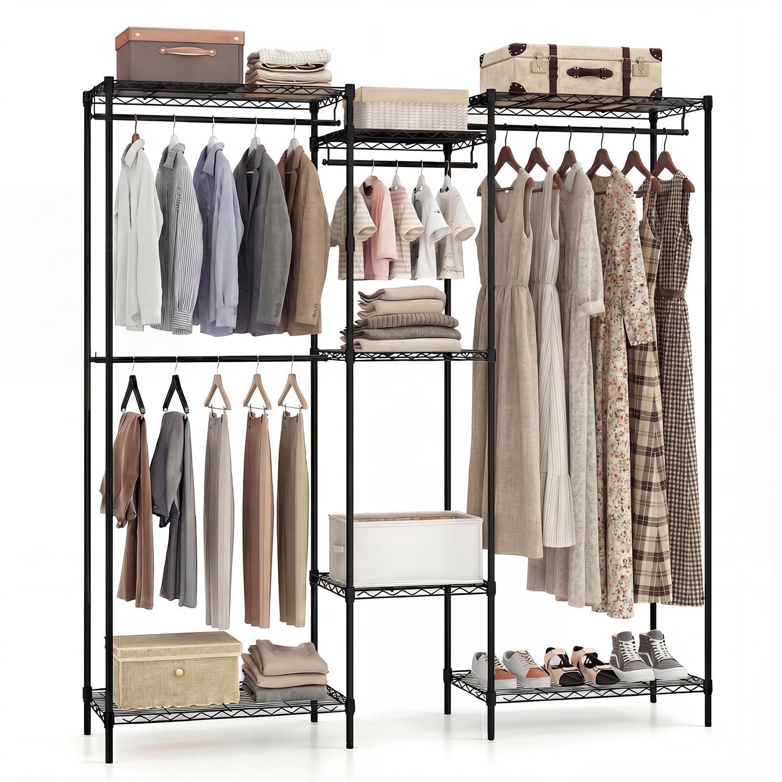 Built tough with reinforced metal shelves and a powder-coated finish, it confidently holds up to 530 kg, keeping your wardrobe secure and organized. Enjoy effortless customization with 7 adjustable shelves and 4 removable hanging rods, perfect for everything from shoes to suitcases. Whether in the bedroom, walk-in closet, or laundry room, this portable wardrobe system adapts to any home and lifestyle. No tools? No problem! Quick, frustration-free assembly means you’ll enjoy your organized haven in minutes. Check the arrow of the tapered locks, snap them together and then insert the shelf, you can freely adjustable the shelf spacing as needed. Revolutionize your storage now! BulletPoint:Flexible Dual-Configuration Design: This freestanding clothes rack offers 2 installation options: a horizontal layout (188 x 46 x 198 cm) for standard wall placement or an L-shaped configuration (118 x 118 x 198 cm) that maximizes corner space. Easily adapt this garment rack to your room’s dimensions and layout for optimal storage efficiency. Industrial-Strength Capacity: Engineered as a heavy-duty garment rack, this unit features reinforced metal wire shelves with a powder-coated finish that supports an impressive 530 kg maximum load. Adjustable foot pads and 2 anti-tipping kits ensure stability on uneven floors, ensuring years of reliable performance in any environment. Customizable Organization System: This closet rack for hanging clothes includes 7 adjustable shelves and 4 removable hanging rods, providing versatile storage for garments, shoes, suitcases, and storage boxes. Freely reposition components on this closet organizer to create a personalized wardrobe system that evolves with your changing needs. Whole-Home Versatility: Seamlessly integrating into any space, this portable wardrobe closet works perfectly in bedrooms, walk-in closets, laundry rooms, and cloakrooms. Its practical and portable design makes this garment rack with shelves a versatile solution for apartments, homes, and temporary living situations. Zero-Tools Assembly: You can measure your reserved space first to see if it will fit. This freestanding closet organizer assembles in minutes using detailed instructions without requiring any tools, making setup effortless for anyone.