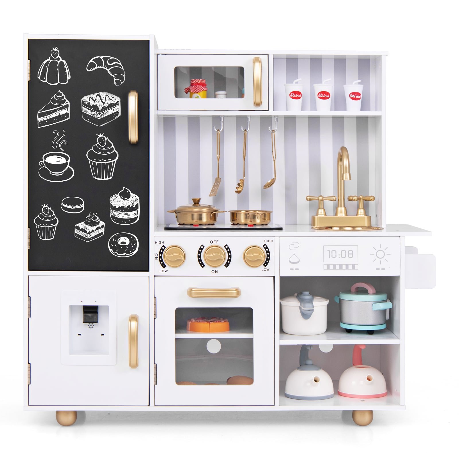 Color: White+Black+Golden Material: MDF Product Dimensions: 84 x 30 x 80 cm (L x W x H) Recommended Age: 3+ Years Old Net Weight: 14 kg Box Qty:1(May vary by batch)Package Includes: 1 x Kid’s Pretend Play Kitchen 1 x Chalk 1 x User’s Manual