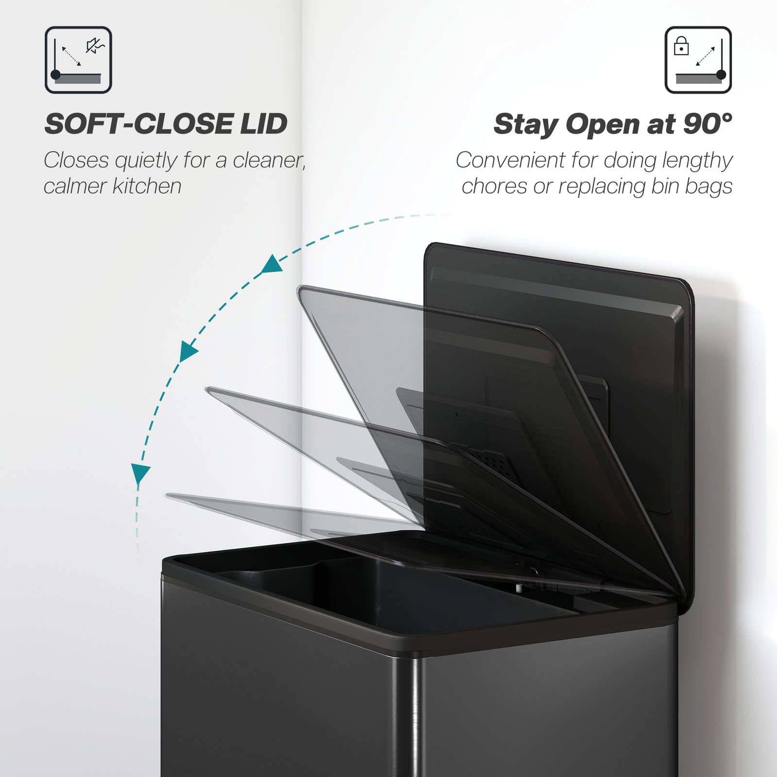 - The lid closes silently and can stay open for easy, hands-free chores