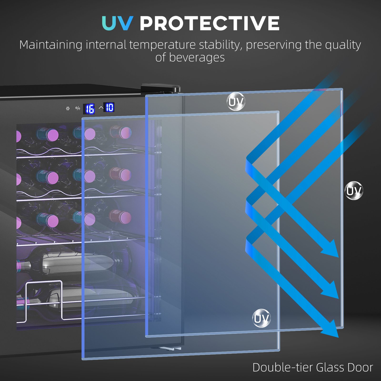 - Bottle Capacity: 16 bottles (Standard 750ml, 7 cm x 31.5H cm)