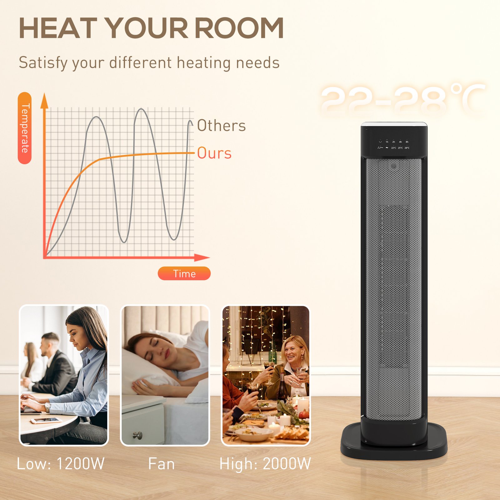 - 60 oscillation spreads warmth evenly to every corner of the room
