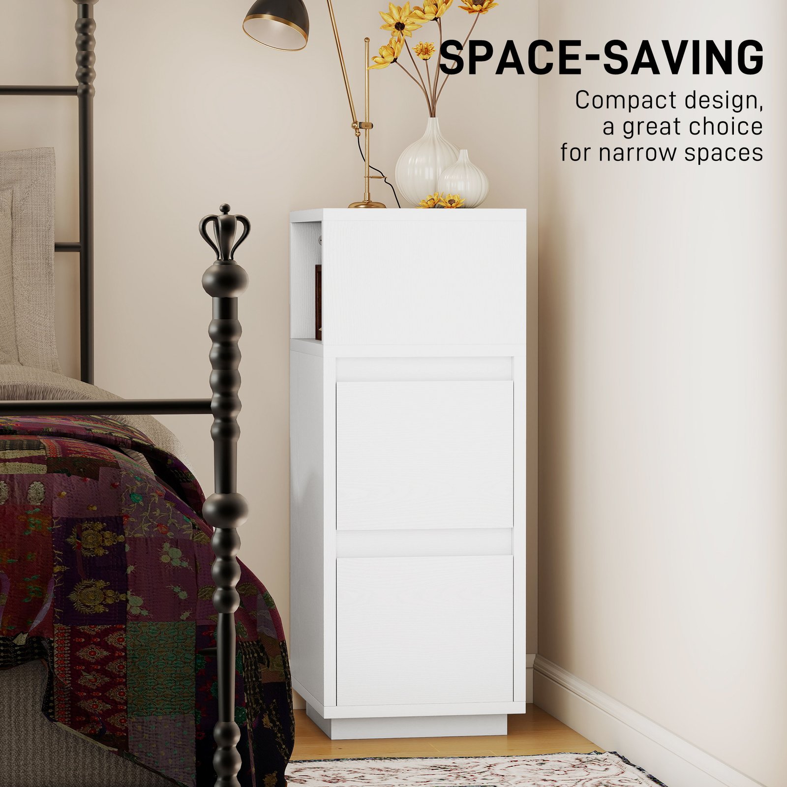 - Vertical design with a top, open shelf and two drawers maximises bedside storage