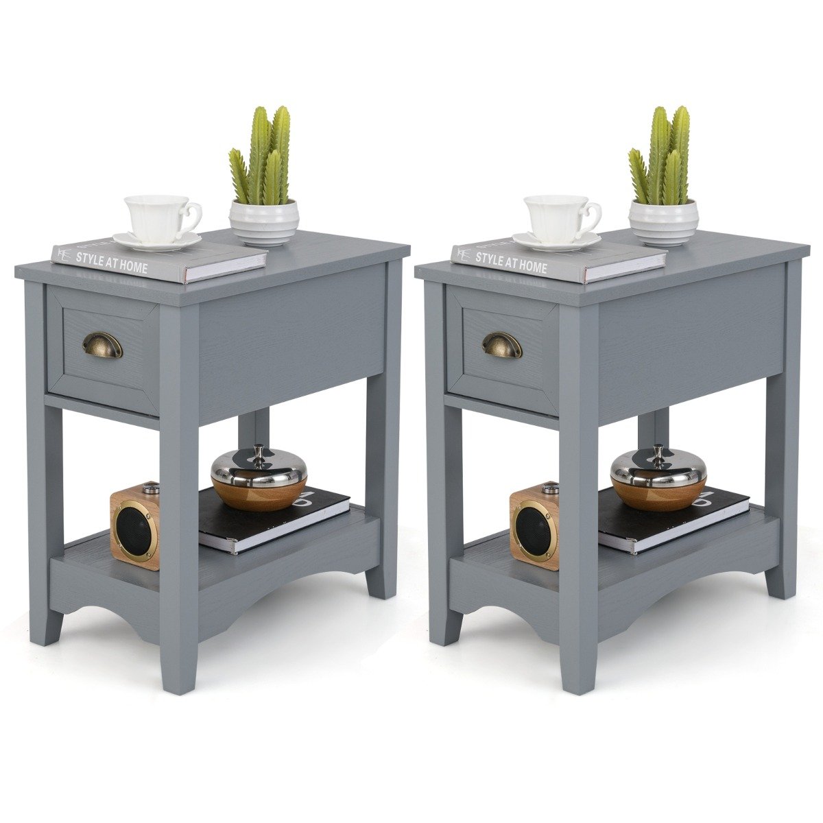 Rectangular Nightstand Set of Two with 1 Drawer 1 Storing Shelf and 4 Solid Rubber wood Legs-Grey