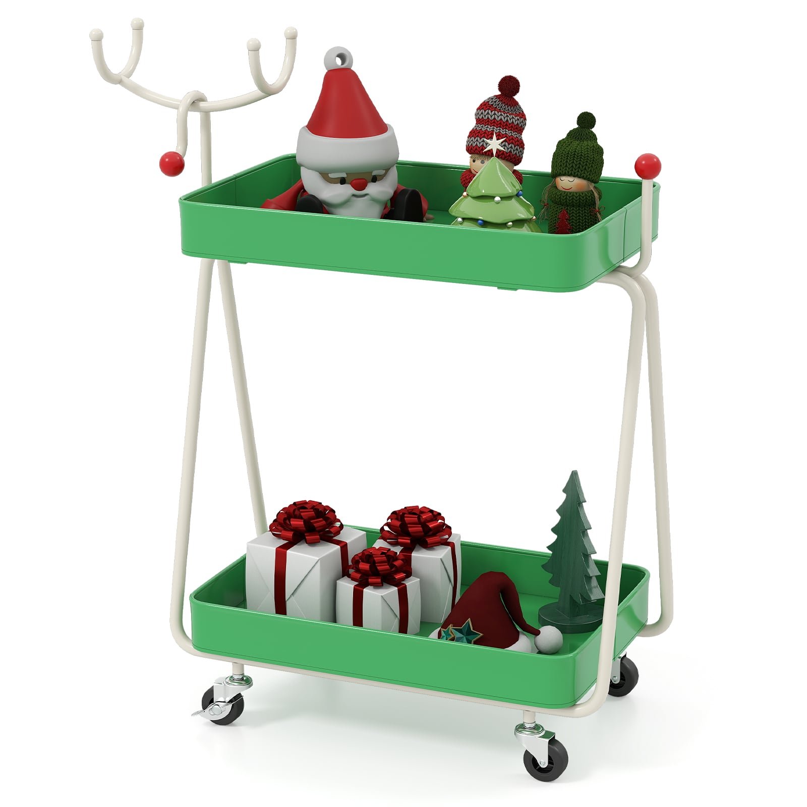 Reindeer Side Table 2-Tier Christmas Rolling Cart with Metal Frame and Wheels-Green