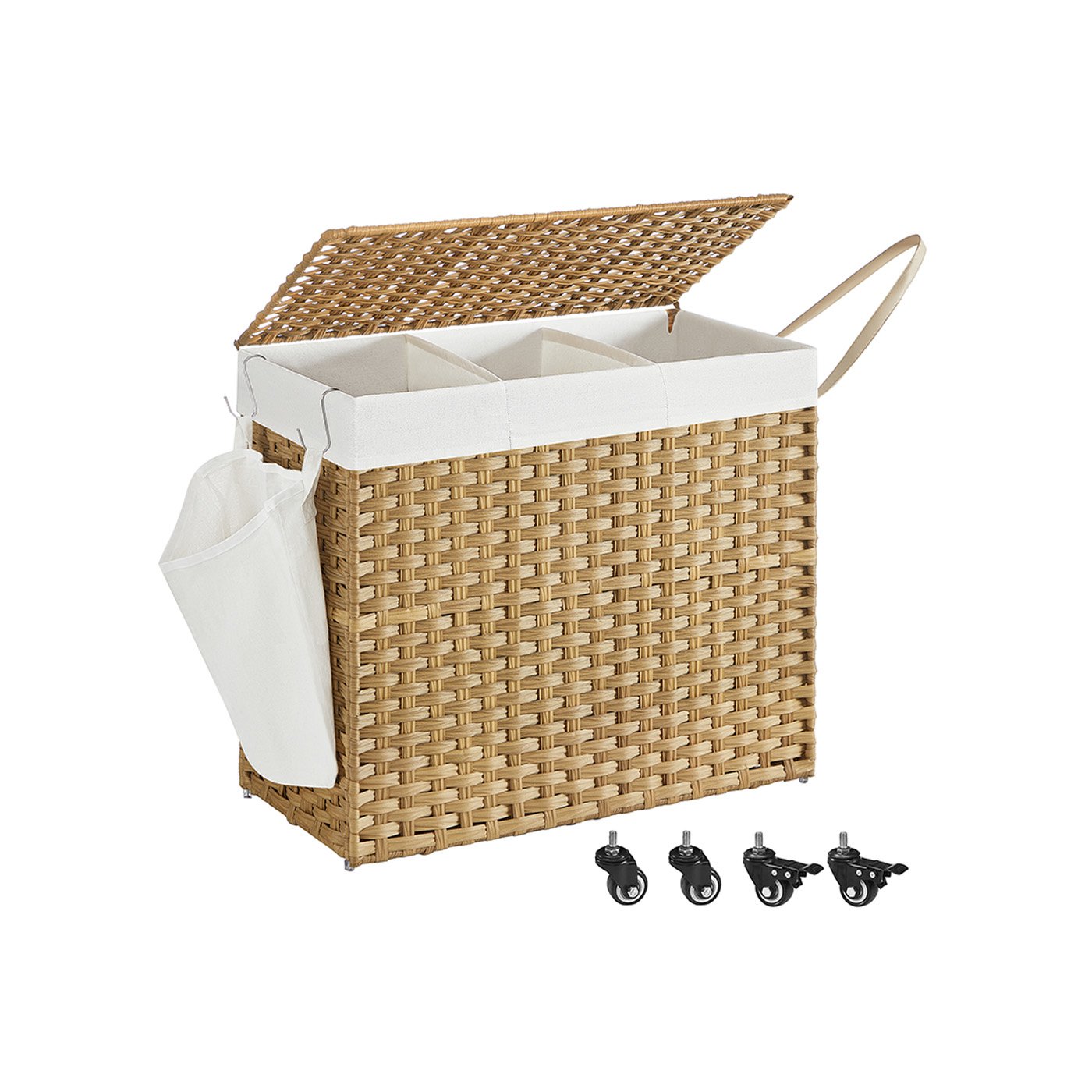SONGMICS Laundry Basket, Handwoven Laundry Hamper, 140L Rattan-Style Washing Basket with 3 Compartments, Removable Liner, Handles, Lid, Living Room, Bathroom, 66 x 33 x 60 cm, Natural LCB363N01