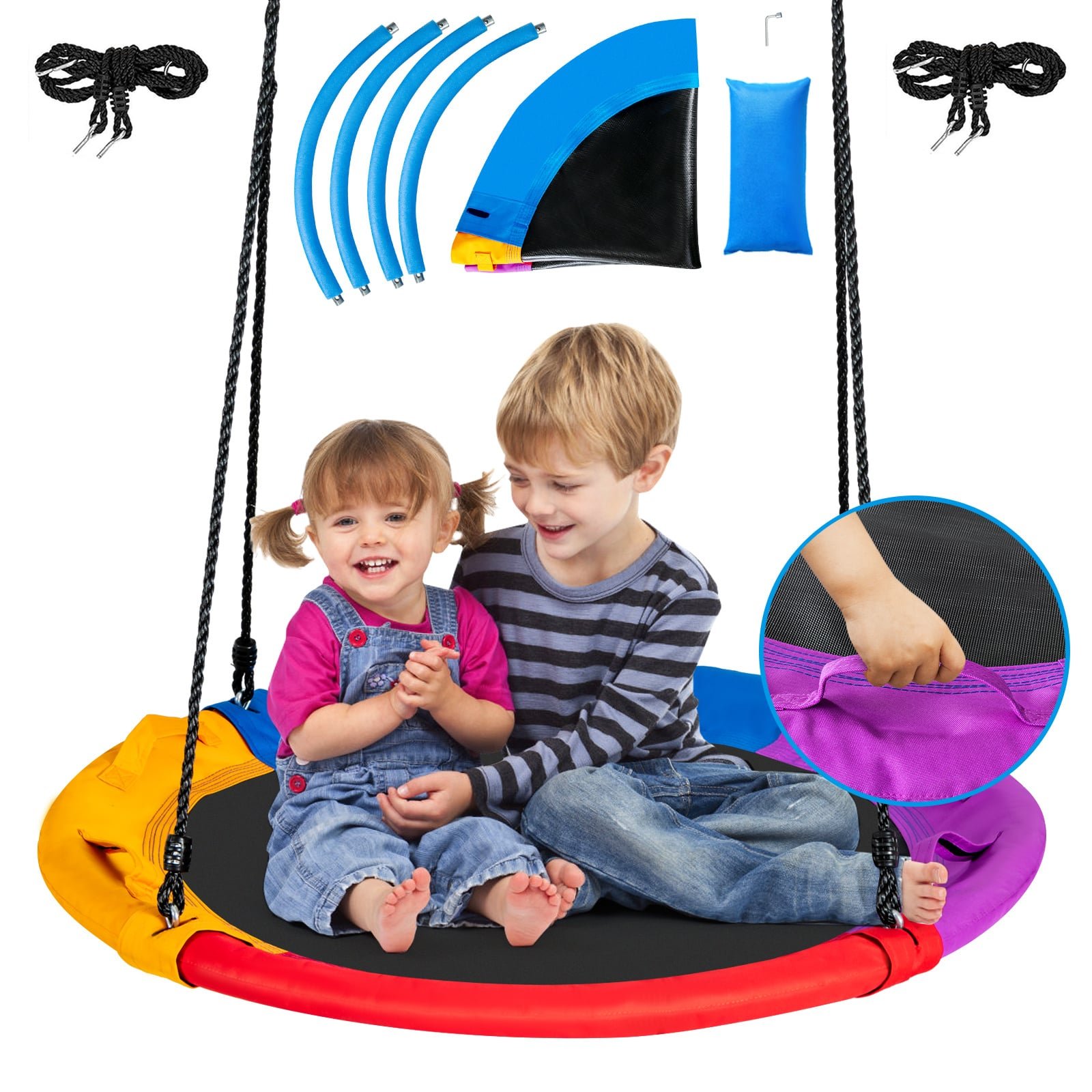 We pay much attention to the safety of our product, so the quality of the swing can be trusted. The ropes are made from PE, and the seat is made from PP and oxford cloth. All these materials plus the galvanized steel frame are designed for outdoor use. Measuring 40 inch in diameter, the swing is big enough for 2-3 kids to use. During the happy swinging time, kids can grip the handles to fix their body to ensure safety. If you want take a nap, the pillow will provide you with comfortable using experience. Hang it on a tree in your backyard to enjoy endless fun of swinging with your children! 40 Inch Saucer Swing Net: The colorful saucer swing net measures 100cm in diameter, which is large enough to hold 2-3 children. The spacious seat allows kids to change their postures freely on it. Kids can lie on it or sit on it safely to enjoy endless fun of swinging with friends or parents. Height Adjustable Ropes: The ropes of high quality are durable to stand various outdoor weather. And the height of the swing net can be adjusted from 100 to 180cm. Therefore, the swing net can perfectly fit in various places. You can hang it on a tree or a steel swing frame casually according to your needs. Super Safety Design: The galvanized steel frame is covered by thick sponge to avoid accidental bumps. Made of PE, the ropes are durable to last for a long time in outdoor weather. And the seat made from thick oxford cloth and PP is wear-resistant. You can install it with one fixed carabiner, two fixed carabiners or one swivel carabiner according to your needs. Extra Pillow & Side Handles: Compared with other products, our saucer swing has a extra pillow and 4 side handles. The pillow is attached to the swing through hook and loop fasteners, so you can detach it for easy washing. You can grip the side handles to enhance safety when enjoying exciting swinging. A Perfect Gift for Children: If you are looking for an amazing gift for your little one, our swing will be a right answer. The swing will greatly increase children’s outdoor activity time and decrease the time spending on electronic games. In addition, you can play with your kids and enhance parent-child relationship through happy swinging time.
