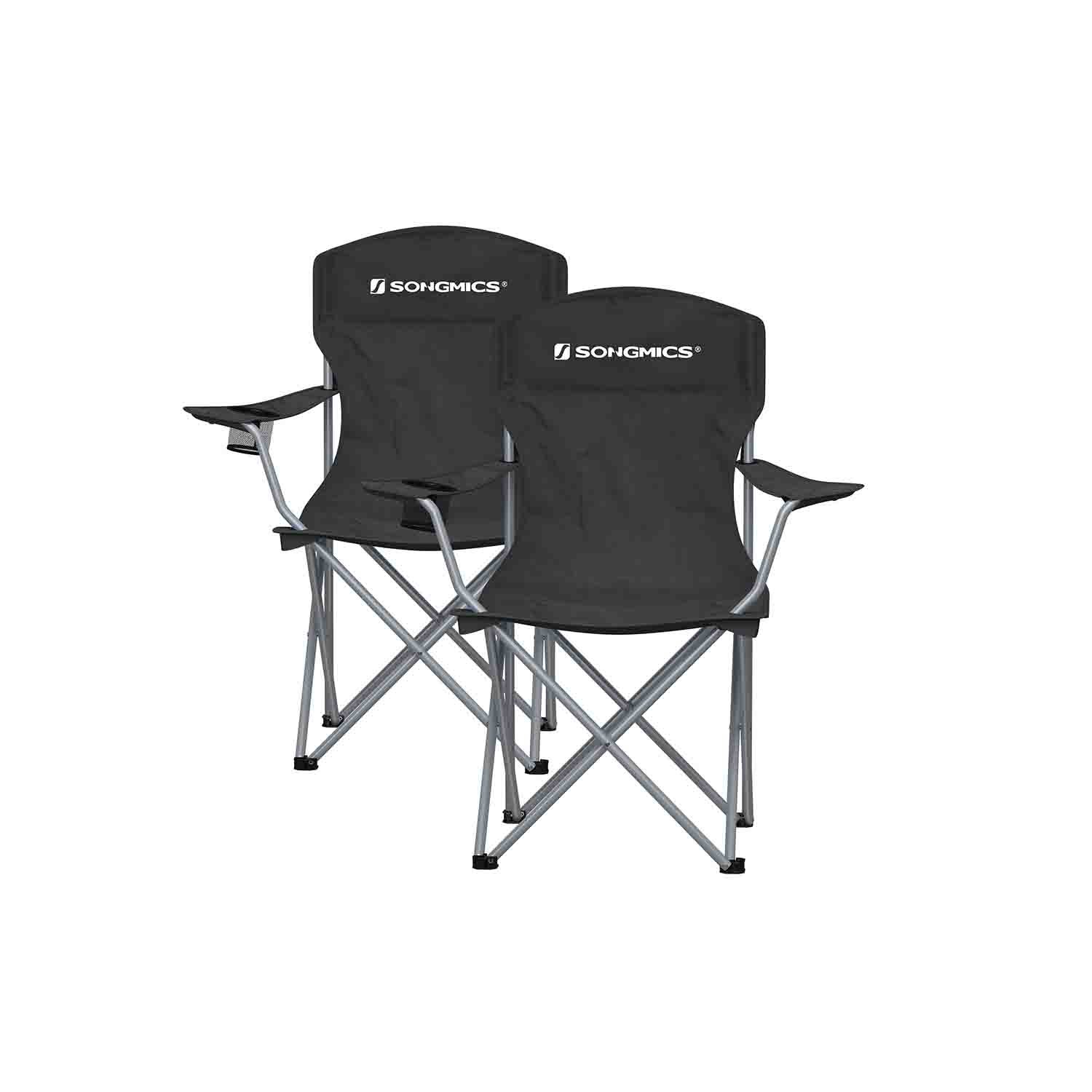 SONGMICS has created a series of outdoor chairs to make the beach, camping and garden more comfortable places to spend relaxing moments doing what we enjoy the most.Fits Everywhere You Go: This versatile camping chair is undoubtedly perfect for camping, but if you’re a fishing enthusiast you can also use it on the banks of the river or the sea, but also at the park if you have a nice family picnic!Comfortable and Practical: After a long day of activity, you will be looking forward to resting on these comfortable camping chairs with a convenient place to keep your favourite drink. Planning a trip away from the base? This chair weighs only 3.2 kg—fold it easily into its carry bag and put it on your shoulder, then you’re ready for the adventure!If you like outdoor activities, take a look at our entire range of SONGMICS Outdoor Chairs.Specifications:- Colour: Black- Material: Oxford 600D Fabric, Powder Coated Iron Frame- Product Size: 76 x 51.5 x 95.5 cm (L x W x H)- Product Weight: 3.2 kg (per chair)- Max. Load Capacity: 150 kg (per chair)Package Contents:- 2 x Camping Chair- 2 x Carry BagSONGMICS Notes:- Never touch it with sharp or pointed objects to avoid damage.