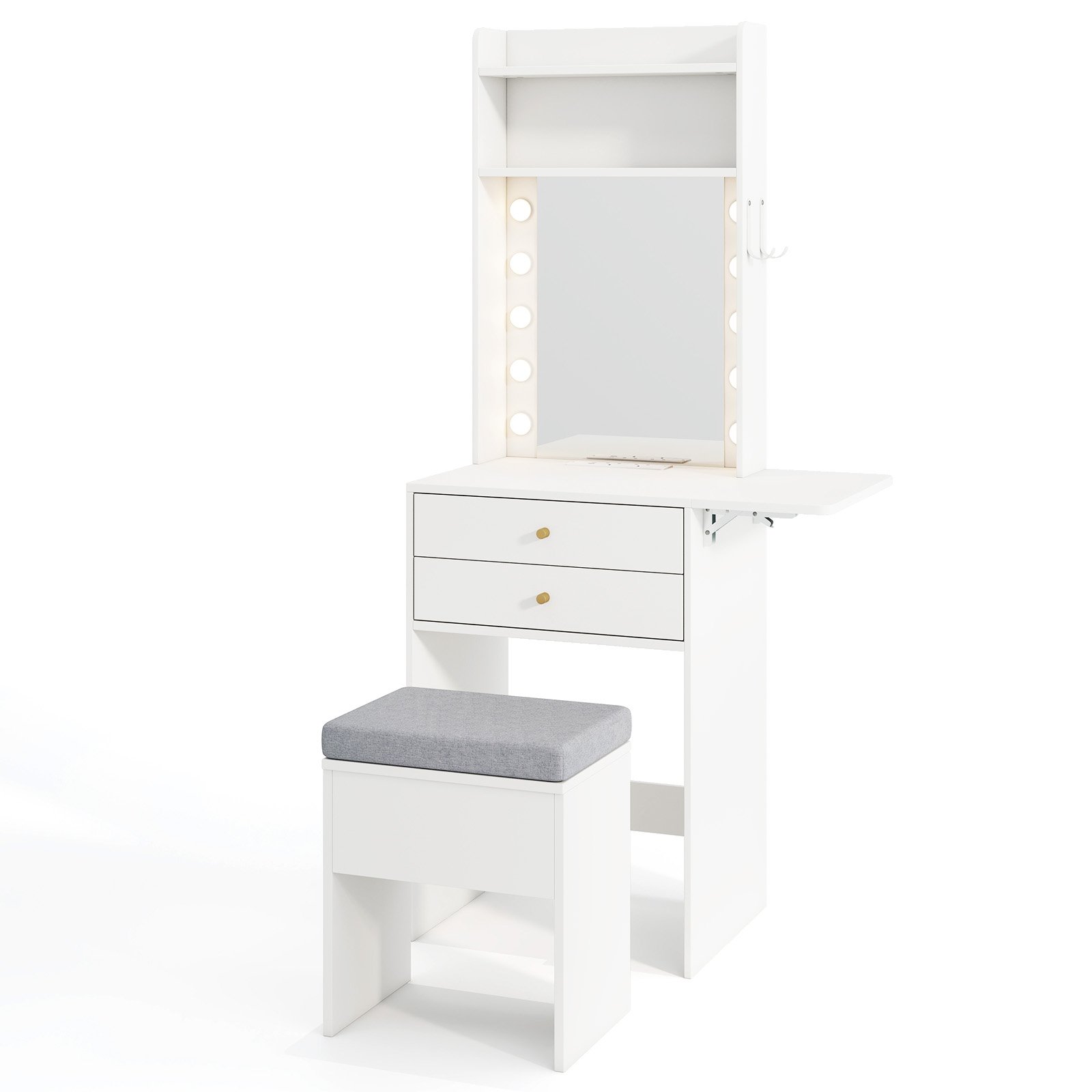 Featuring 2 shelves, hooks, drawers, a drop leaf countertop, and a stool with hidden storage, this dressing table set provides roomy space for all your beauty essentials. Moreover, you can enjoy customizable LED lighting with 3 modes for perfect makeup application. The built-in charging station includes AC outlets and USB port for convenience. The functional design includes a space-saving drop leaf countertop, perfect for small rooms. If you are looking for such a product, do not hesitate to buy it! Compact Size Yet Large Capacity: This vanity desk comes equipped with 2 open shelves, 2 hooks, 2 drawers, a drop leaf countertop, and a stool with hidden storage space under the seat, providing plenty of space to store cosmetics, jewelry, and other personal items neatly. Adjustable LED Lighting: You can experience the perfect lighting for makeup application with 3 lighting modes, adjustable to warm yellow, warm white, or cool white. The adjustment is simple through the touch switch. Built-in Charging Station: Equipped with 2 AC outlets, 1 USB port, and 1 Type-C port, this charging station can keep your devices fully charged, which brings more convenience to use and charge your smartphone or hair dryer without cluttering your workspace. Compact & Functional Design: This makeup table includes a drop leaf countertop that creates a larger tabletop without occupying extra floor area. It’s perfect for small bedroom or other compact spaces while offering ample room for beauty routines. Well-Made Details: The anti-falling raised edge and anti-toppling devices offer enhanced safety. Moreover, the matching stool comes with a soft padded seat cushion for comfy seating experience.