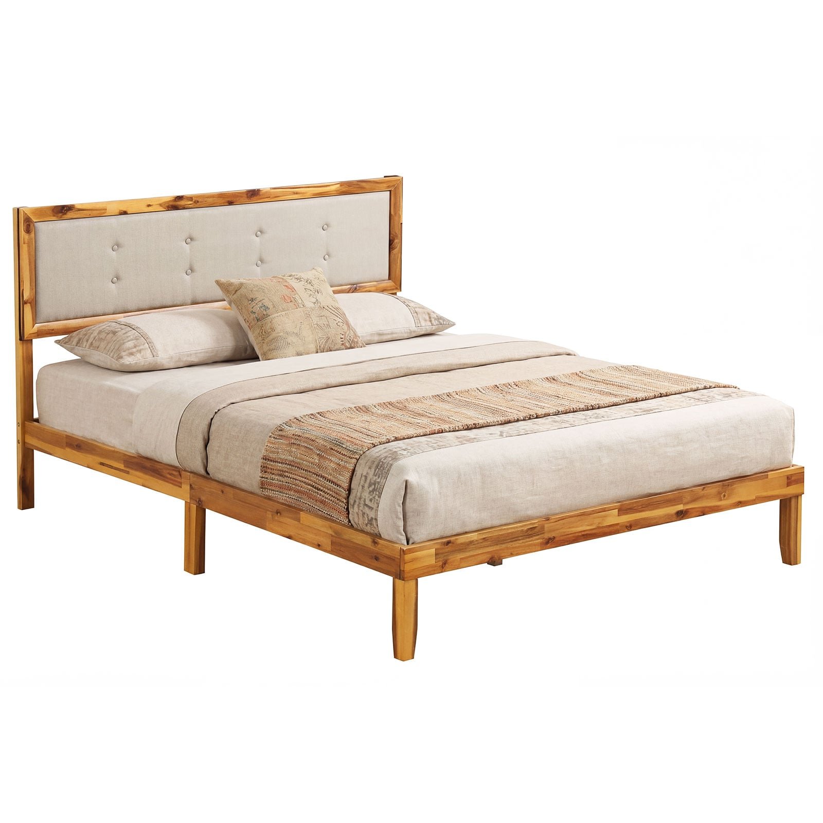 Celebrate the natural beauty and stay-forever style that keeps your sleep sanctuary looking perennially polished. Unwind in luxury against the cloud-like tufted headboard adorned in chic linen-like fabric, while seamless support awaits beneath thanks to a rock-solid base designed to eliminate squeaks and sags. Say hello to organizational bliss with generous under-bed storage, and goodbye to bulky box springs with our streamlined, space-maximizing design. Don’t wait to transform your bedroom into a lavish retreat—upgrade your nightly escape today, effortlessly combining sophistication, comfort, and practicality. Dive into a better bedtime now! Solid Acacia Frame: This solid wood bed is crafted from premium Acacia, whose high density and natural oils fight dents and warping for a lifetime of use. The rich, contrasting grain stays gorgeous year after year, so your bedroom always looks warm and inviting.Comfortable Tufted Headboard: A platform bed with headboard like this one wraps soft foam in breathable linen-look fabric, giving your back cloud-like support while you read or watch TV. Deep-button tufting adds timeless elegance that instantly upgrades the whole room.Reinforced Slat Base: The wooden bed frame hides 12 plywood slats and a central beam beneath the mattress, creating a rock-solid base rated for 260 kg. Nine robust legs spread weight evenly, so the bed never squeaks or sags, even after years of restless sleepers.Ample Under-bed Space: A 22.5 cm clearance under this slatted bed lets you slide suitcases, shoe racks or seasonal storage bins completely out of sight. The open sides also let a robot vacuum glide through, keeping pet hair under control with zero effort.No Box Spring Needed: Simply lay any standard mattress on the upholstered bed frame and the recessed edge locks it in place, preventing midnight sliding. You save the cost of a box spring and gain a sleeker, lower profile that makes small bedrooms feel bigger.