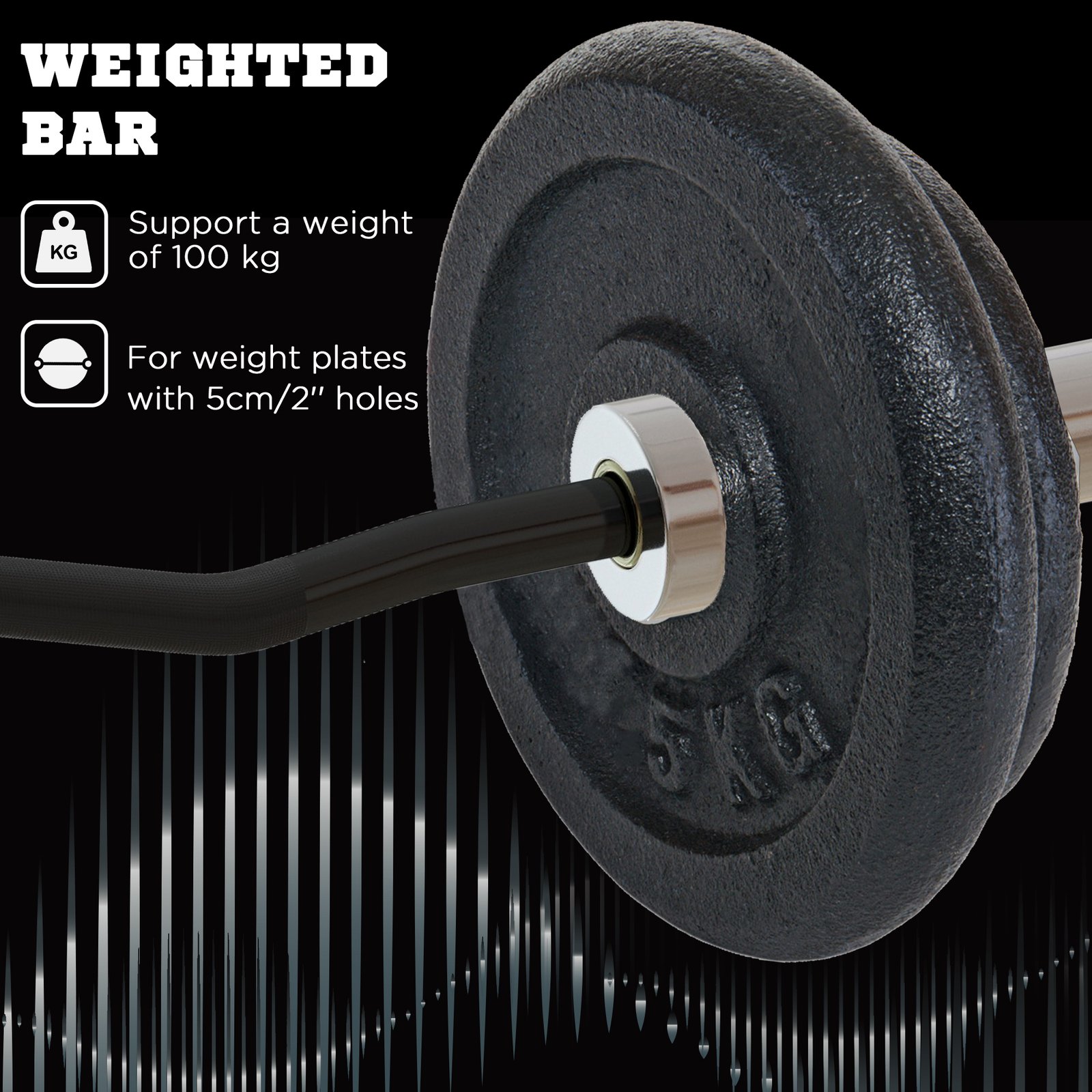 - A curl bar suitable for weight plates with 5cm holes and a 5cm wide barbell jack to hold a universal barbell bar