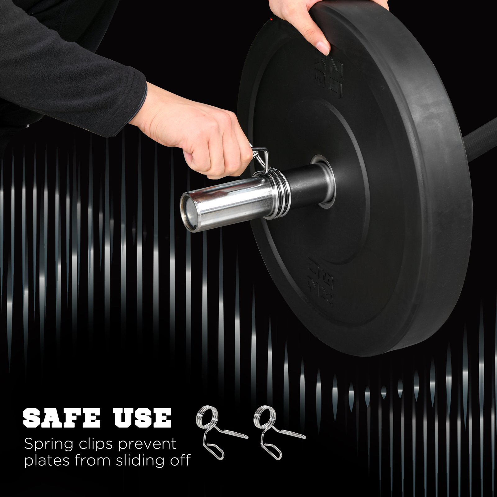 - Two safety spring buckles holding the weight plates in place