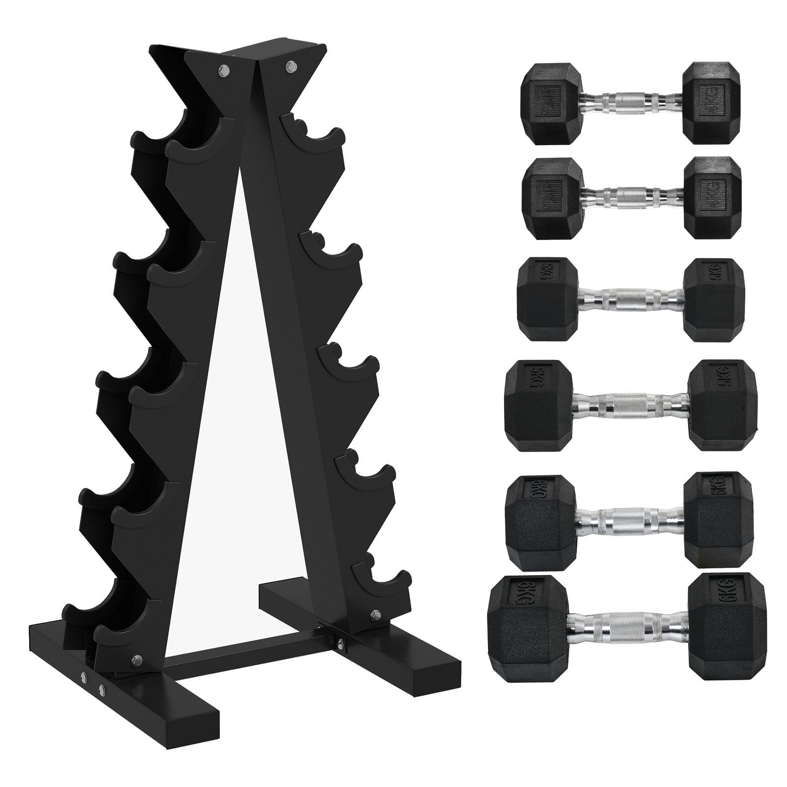 SPORTNOW 5-Tier Dumbbell Rack with 6 Hexagonal Rubber Dumbbells (2x4kg, 2x5kg, 2x6kg), Dumbbell Storage Stand Holder with Weights Sets for Home Gym Fitness, Black