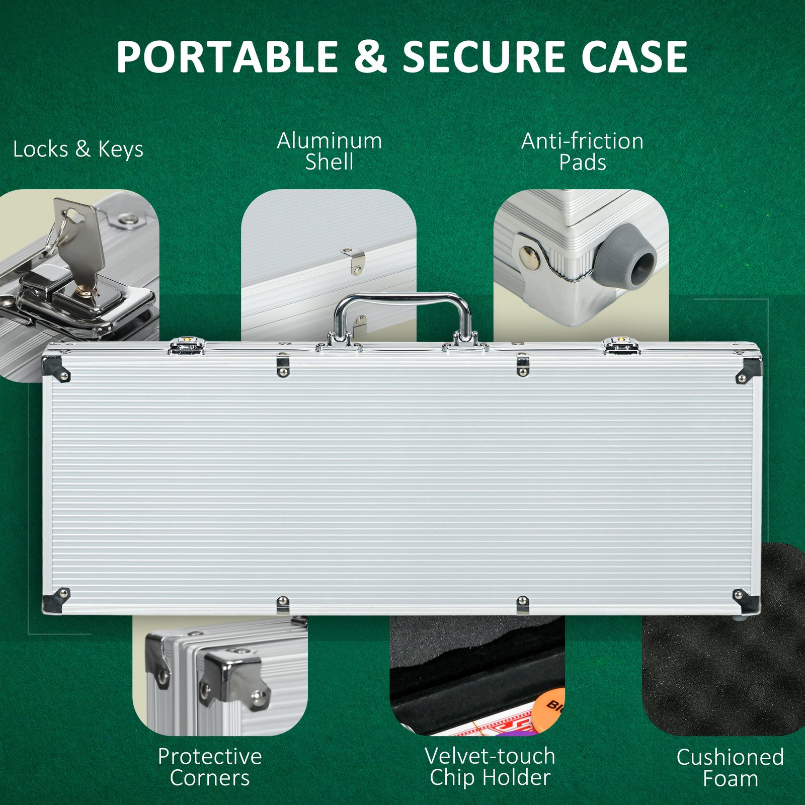 - Robust aluminium case featuring foam cushioning inserts and velvet-touch chip holder