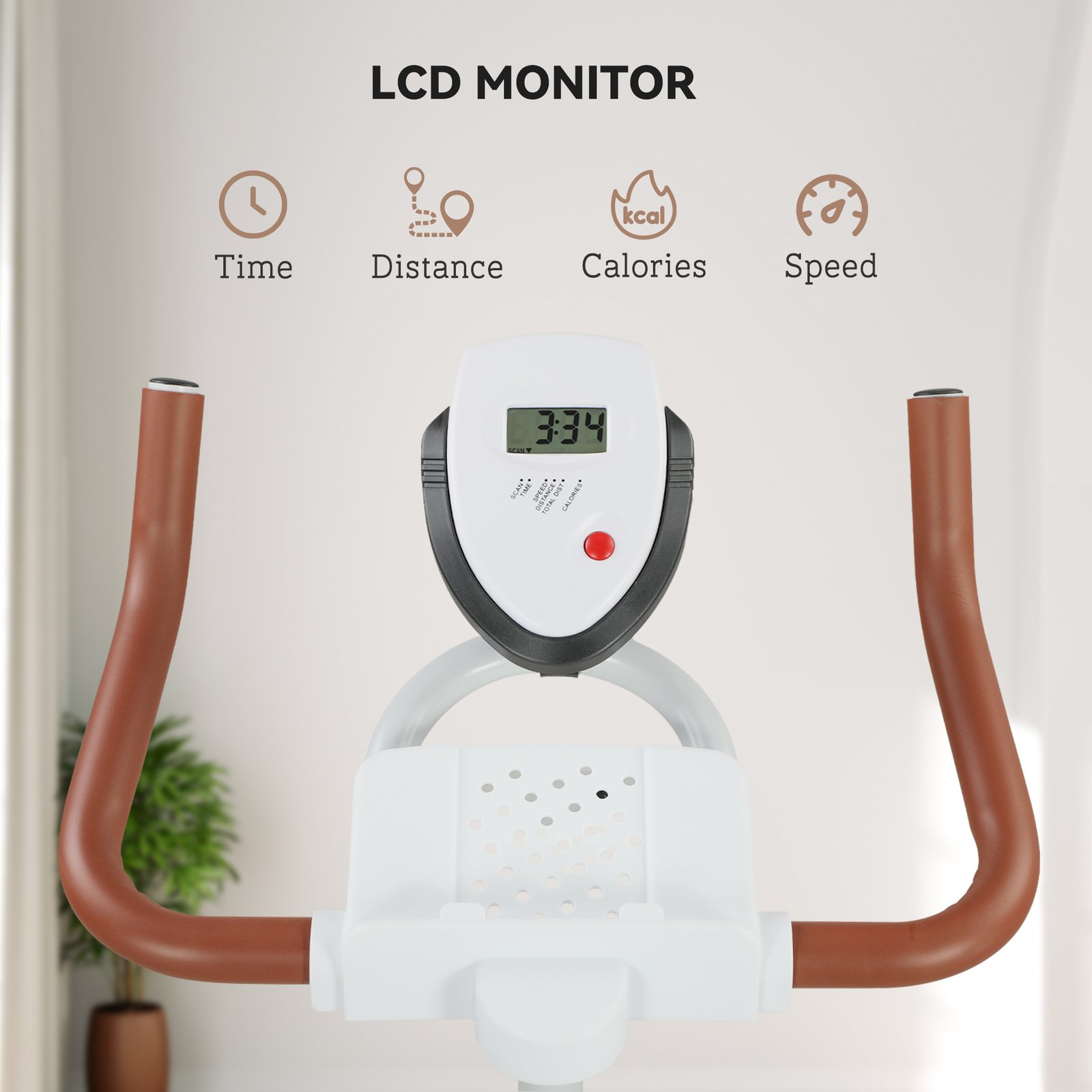 Achieve your fitness goals at home with the SPORTNOW static bike. Adjust the resistance to your comfort level and increase it as you get stronger for a more intense workout. The seat and handlebar can also be adjusted to fit different heights, ensuring comfort. The LCD display shows time, distance and calories, helping you track your progress. Great for any home gym, its stylish design fits right in, while the built-in wheels make it easy to move wherever you want.