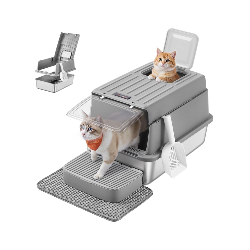 Feandrea Stainless Steel Cat Litter Box with Flip Lid, Scoop, Litter Mat, 2 Doors, for Cats up to 15 kg, Light Grey PPT007GD01