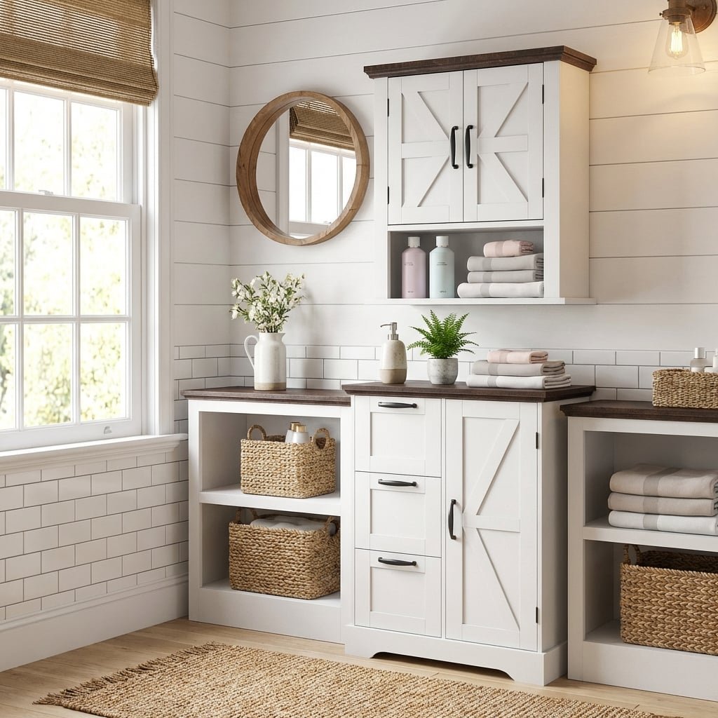 This versatile storage duo combines the charm of a vintage barn door design with organized functionality, featuring a wall-mounted medicine cabinet and a matching freestanding floor cupboard. The set offers expansive storage possibilities, from a tabletop for decorations and deep drawers for kitchenware to a 2-tier wall cabinet with a height-adjustable shelf and open compartments for everyday essentials. Built from durable MDF with a wipe-clean finish, each piece is designed for longevity and ease of use, incorporating premium hardware such as magnetic catches, smooth metal hinges, and easy-grip handles. Safety and stability are prioritized with pre-drilled mounting holes and two sturdy anti-tip kits, making this ensemble a perfect fit for bathrooms, kitchens, entryways, or living rooms. Generous Storage Hub: The floor cabinet offers a spacious tabletop for decorations, and behind door lies 2 shelves that swallow everything from dishes to daily clutter. Plus, the 3 deep drawers can accommodate household in an organized manner. Ample Storage Space: This medicine cabinet includes a convenient top shelf, an open compartment for everyday essentials, and a 2-tier cabinet with a height-adjustable shelf offering 3 flexible positions. Reliable Quality & Safety: This farmhouse cabinet set combines premium craftsmanship with family-safe stability, featuring smooth metal hinges, secure magnetic catches, and handy handles for effortless daily use, while the included dual anti-tip straps ensure the unit stands rock-solid and securely anchored to the wall to prevent accidents in high-traffic areas. Charming Farmhouse Focal Point: This storage collection seamlessly blends authentic cottage character with modern functionality, featuring distressed wood grain, barn-style doors, and vintage accents that elevate any space. Designed to be a room’s natural focal point, its unique mix of rustic charm and clean lines adds warmth and personality to your decor without requiring any extra styling.
