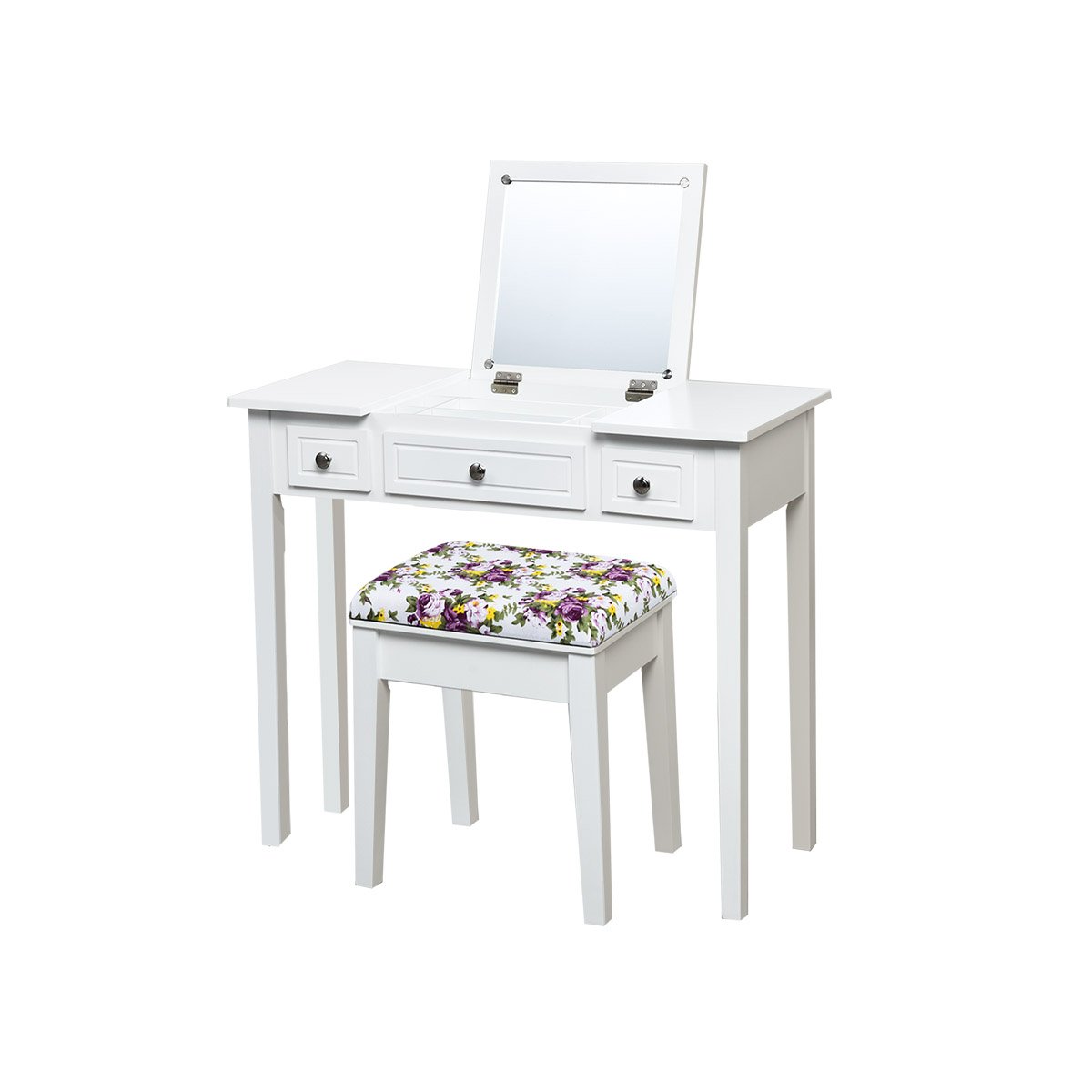 This vanity table set with flip top mirror is a perfect solution for your makeup needs. Compared with other ordinary dressing tables, our table set features flip top mirror to help you make up. You can use it as a makeup table or even a writing table by flipping the mirror. In addition, it is made of high quality, which ensures long-term use. And the stool is cozy and elastic, offering you comfortable sitting experience. If you are looking for a table set for dressing up or a gift for your other half, this vanity table set will be an ideal choice. 2-in-1 Multifunctional Design: The flip top mirror can be easily opened or closed with the premium metal hinges for multifunctional usage. It can be used as an ideal dressing table for makeup when you open the mirror. Also, the table is quite suitable for work or studying after you fold the mirror. Spacious Storage Space: The wide desktop and three drawers provide ample space for storing daily essentials such as books, plants, stationaries and more. What’s more, the hidden compartment is divided into 7 parts to efficiently classify your cosmetics and ornaments, thus organizing your dressing-up space. Selected Material and Sturdy Structure: Made of high-grade wood material, the table set is excellent in durability and stability. The solid legs keep it more stable without shaking. The table can hold up to 132kg, while the chair can withstand a maximum weight of 114kg. Stylish and Comfortable Stool: The stool cushion is filled with high-density and soft sponge, giving you super comfort while making up. And you will not feel stuffy due to the breathable cover. Additionally, the stylish and delicate pattern makes it suitable for multiple occasions such as bedroom, living room, dressing room, etc. Fast Installation and Easy Maintenance: Come with all necessary hardware kits included in the package, the table set is quite simple to assemble just by following the easy-to-understand instruction. As the surface is waterproof and smooth enough, it’s convenient to clean up the table set with a damp cloth.