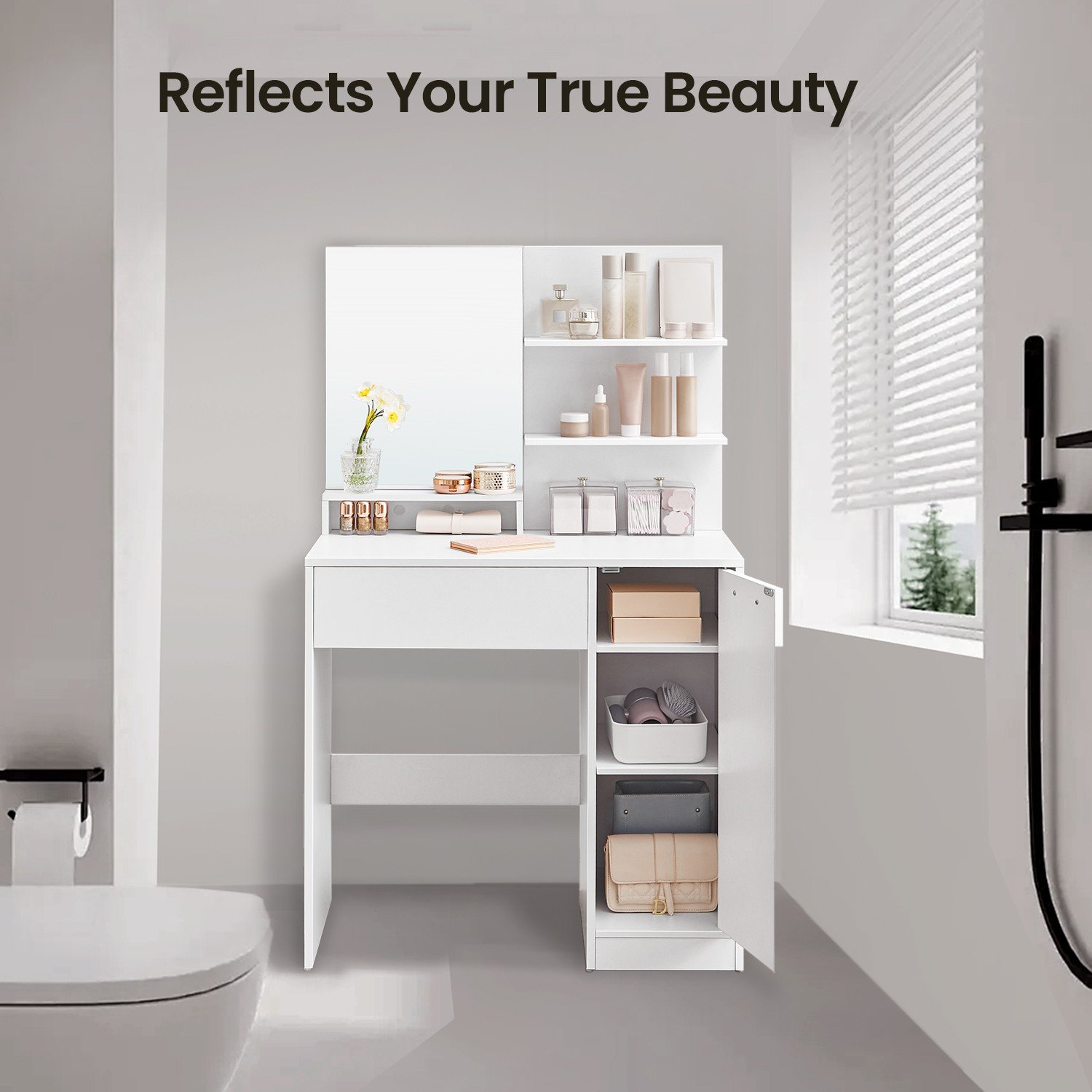 Vanity Table with Mirror, 1 Drawer, 2 Shelves, Storage Cabinet, Makeup Organizer, Cloud White