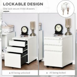 Transform your workspace with the metal filing cabinet from Vinsetto, the lockable drawers with a flat top surface that double as a printer stand. This compact three drawer filing cabinet fits snugly under your desk, featuring a top lock for security and smooth-rolling casters for easy mobility. Organise effortlessly with adjustable rails for three file sizes, ensuring everything you need is just a quick drawer pull away.