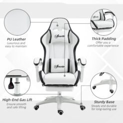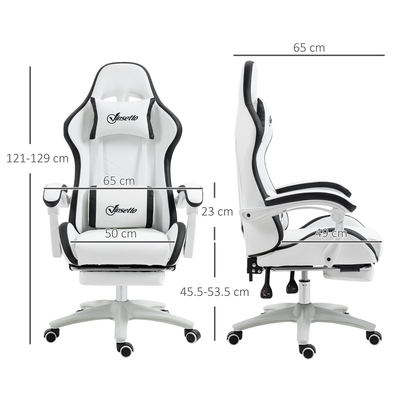 Keep comfortable and focused in the game: do it with this Vinsetto gaming chair. Faux leather upholstery is sleek, with a coloured border all over for a touch of impact. Padded all over, with head and lumbar pillow included for comfort. The back reclines to a maximum 135, with a pull-out footrest to elevate the lower body. Adjust the height between 45.5cm and 53.5cm, to game at a position best for you.