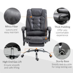 Work and relax, with this Vinsetto massage office chair. Wrapped in smooth and stylish microfibre upholstery, this computer chair is great to sit on and look at! But, most importantly, it has six heated massage points – four on the back, two on the seat: simply turn on the remote and relax. The seat gives wide sitting room, a high back and arms for support. With a 135 reclining backrest, finished with a manual footrest to elevate your lower body with ease.