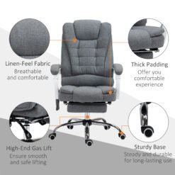 Work and relax, with this Vinsetto massage office chair. Wrapped in linen-look fabric, this computer chair is comfortable to the touch. But, most importantly, it has six heated massage points – four on the back, two on the seat: simply turn on the remote and relax. The seat gives wide sitting room, a high back and arms for support. With a 135 reclining backrest, finished with a manual footrest to elevate your lower body with ease.