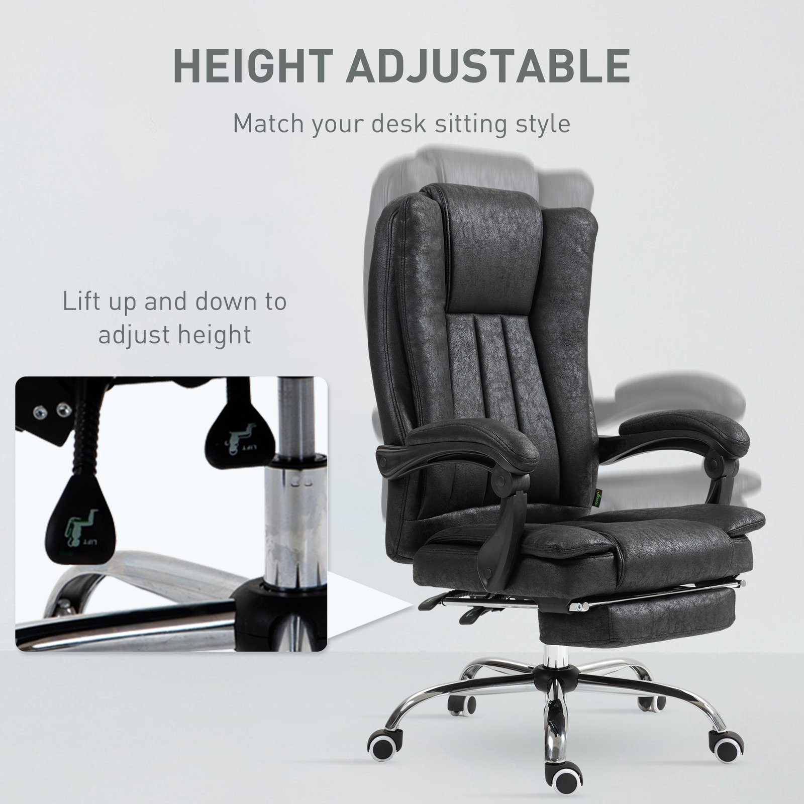 A piece to make your working days comfortable and not so draining: this high back office chair from Vinsetto. The luxurious design consists of thick padded, soft microfibre upholstery, a reclining back, and a manual footrest. The seat height of the computer chair is adjustable for a working level best for you. Finished with five wheels to move around easily.