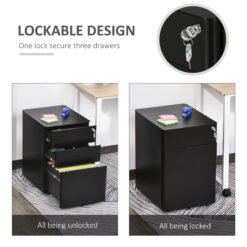 Maximise your space with the three drawer filing cabinet from Vinsetto that offers spacious storage and a top surface, doubling as a printer stand. Enjoy organised ease with adjustable hanging rail for three different file sizes and a lock to secure your important essentials. What’s more, the Vinsetto lockable drawers with compact design fits neatly anywhere and rounded corners prevent accidental bumps, making it a great office ally.
