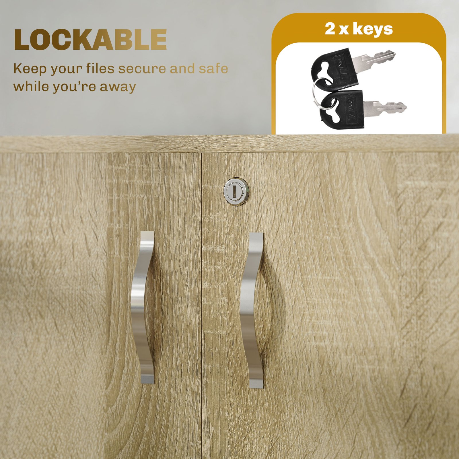 Keep the office organised and the area looking beautiful with this Vinsetto oak storage cabinet. With two hinged doors for easy access, inside a longline shelf sits to create two tiers for organisation of your files and papers. Made from particle board, this piece is tough and reliable for everyday use. It’s finished with feet to protect your floor and a lock for security. Comes with two keys.
