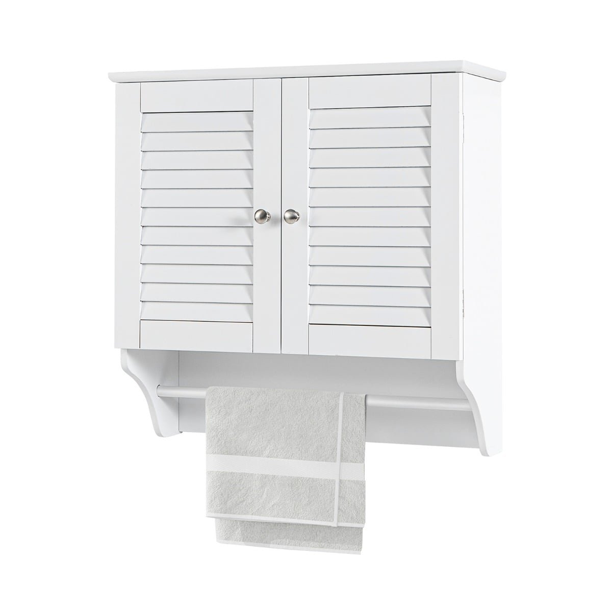 Wall Mounted Double Louvered Doors Storage Cabinet with Height Adjustable Shelf and Towels Bar-White