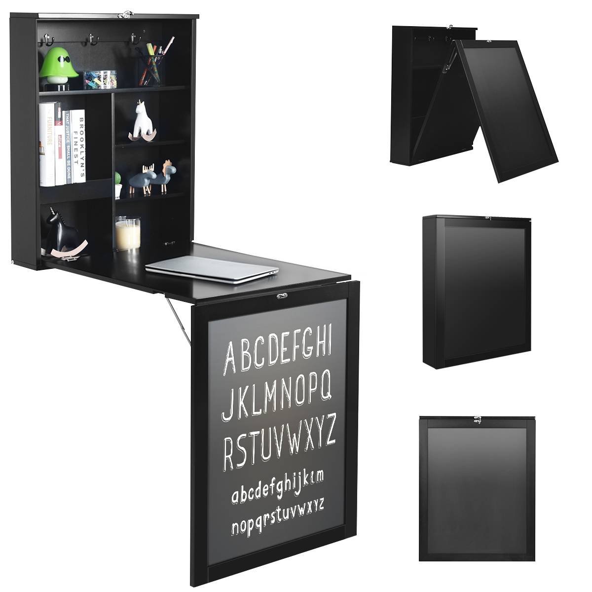 Wall Mounted Floating Computer Desk with 3-tier Tilt Storage Partition-Black