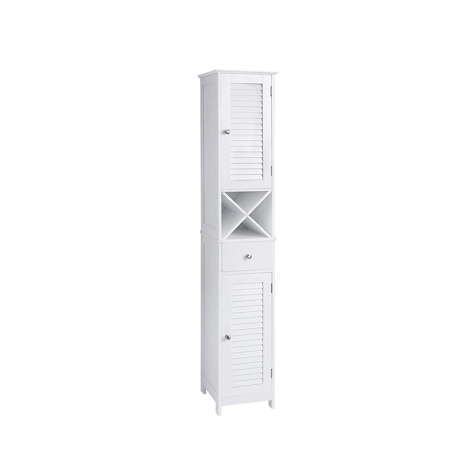 Space GaloreEverything you need will have its own organisational space. Roll up the towels and place them on the X-shaped stand, put shampoo and shower gel behind the doors to keep them away from moisture.Serves the Whole FamilyAttach the floor cabinet to the wall with the included anti-tip kit to offer a safe place for your family. Perfectly combining style and function, it brings a fresh air into your bathroom, entryway, or balcony, and meets your whole family’s needs.Specifications:- Colour: White- Material: E1-Grade MDF (Medium Density Fibreboard)- Product Size: 32 x 30 x 170 cm (L x W x H)- Product Weight: 15.9 kg- Max. Static Load Capacity: 20 kgPackage Contents:- 1 x Bathroom Cabinet- 1 x Anti-Tip Kit- 1 x Accessory Kit- 1 x Instructions (EN, DE, FR, ES, IT)VASAGLE Notes:- Children are not allowed to climb on the product for safety reasons.- The maximum static load capacity of the product is 20 kg. Please do not exceed its weight limit.- Please fix the product to the wall with the included anti-tip kit for safety.