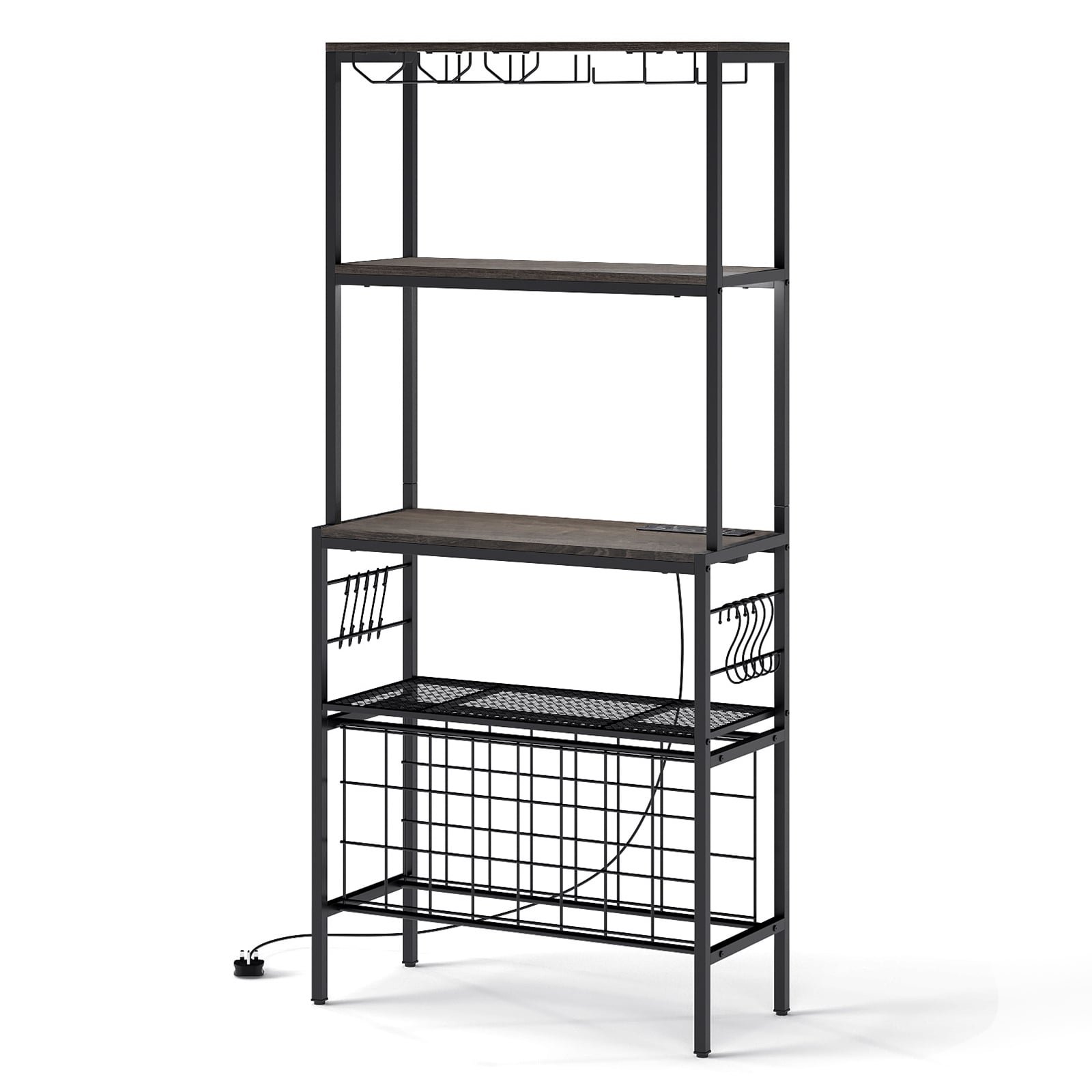 Wine Organizer with Power Outlet Multi-Tier Bakers Rack with Glass-Grey