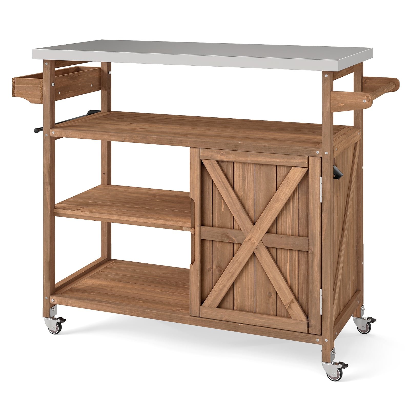 Look no further! This grill cart features a premium stainless steel tabletop that is waterproof, easy to maintain, and provides a hygienic and sturdy workspace for food preparation and serving. Constructed with a natural fir wood frame treated with water-based paint, it offers durability and a natural appearance that complements any outdoor setting. With ample storage solutions, including a large tabletop, 3 open shelves, a wide two-door cabinet, and a spice rack, you can keep all your grilling essentials within reach. Equipped with 4 universal wheels and a convenient handle, this grill cart is incredibly portable, and the 2 lockable wheels ensure it stays steady when in use. Whether you're hosting a picnic, a party, or simply enjoying a family meal outdoors, this versatile grill cart is perfect for a variety of outdoor activities and will enhance your cooking experience. Premium Stainless Steel Tabletop: Made of premium stainless steel, the wide tabletop is both waterproof and easy to maintain. Its rustproof and heat-resistant surface provides a hygienic and sturdy workspace for food preparation and serving.Natural Wood Frame: The grill cart is constructed with a natural fir wood frame, treated with water-based paint for durability and a natural appearance. The surface is treated with water-based paint for added durability and a natural appearance.Sufficient Storage Space: This grill cart offers ample storage solutions to keep all your grilling essentials within reach. It features a large tabletop, 3 open shelves, a wide cabinet, and a spice rack. These storage options provide plenty of room for grilling tools, condiments, and accessories.Easy Movement: Equipped with 4 universal wheels and a convenient handle, this grill cart is incredibly portable for you to move it anywhere with ease. Plus, the 2 lockable wheels make the cart stay steady for your convenience.Wide Application: This versatile grill cart is suitable for a variety of outdoor activities. Whether you're hosting a picnic, a party, or simply enjoying a family meal outdoors, its multiple thoughtful details make it incredibly practical.